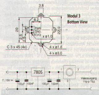 Das Ding wurde bestellt und als es dann eintraf, dann war Bastelstunde angesagt. Mittlerweile wurde das Gerät in ein schönes schwarzes Gehäuse eingebaut und ein Verbindungskabel führt zu einem Versorgungsmodul, welches das Gerät mit dem nötigen Strom versorgt. Die Regelschaltung mit dem 7805er befindet sich im Kameramodul. Das hat den Vorteil, daß man sich eine zusätzliche Stromversorgung leicht selbst basteln kann und daß ein ev. Spannungsabfall zwischen Vorsorgungs- und Kameramodul nicht ins Gewicht fällt. Derzeit habe ich die Wahl, das Gerät mit einem 9 V Akku oder einem Akkupack mit acht 1,2 V Mignon Akkus zu versorgen. Gemessen habe ich aber eine Stromaufnahme von ca. 30 mA, dies wird aber wohl daher herrühren, daß der 7805 auch einen Eigenstromverbrauch hat.
